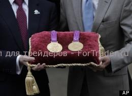 Sebastian Coe, right, chairman of the London 2012 Organizing Committee, and Jan du Plessis, left, Rio Tinto mining company chairman, pose for the photographers holding a gold medal of the Games, during a photo op at the Tower of London, in London, Monday, July 2, 2012 The company is responsible for the production of the precious metals for the London 2012 Games medals, and has handed over the final Olympic and Paralympic medals to LOCOG for secure storage in the vaults at the Tower of London during the Games. The gold, silver and bronze medals which will be awarded to the athletes at Games-times, will remain there until they are needed for the Victory Ceremonies. In total, 4,700 medals have been produced and will be awarded in 805 Victory Ceremonies that will take place in over 30 London 2012 venues across the UK. (AP Photo/Lefteris Pitarakis)