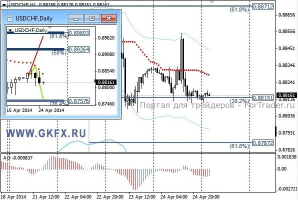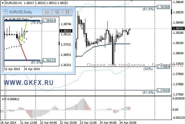 Пара EURUSD в начале европейских торгов росла на сильных данных Ifo. Затем резко снижалась на лучших, чем ожидалось, данных по США, но быстро вернула утраченные позиции. Связывают снижение доллара с обострением ситуации в Украине, где произошло столкновение военных с протестующими и в результате имеются жертвы. Реакция России — это возобновление учений около Украинской границы и резкие заявления о военном вмешательстве в случае угрозы жизни жителям юго-востока Украины. Прицел участников рынка вновь смещается на Украину. На эту неделю традиционно рассматриваются два варианта возможного движения цены: основной красный и альтернативный зеленый. Значимые уровни на сегодня отмечены на часовом графике. Индикатор АО находится в положительной зоне и снижается, указывая на коррекцию перед возможным продолжением роста. Индикатор тренда указывает на рост. Вне рынка.