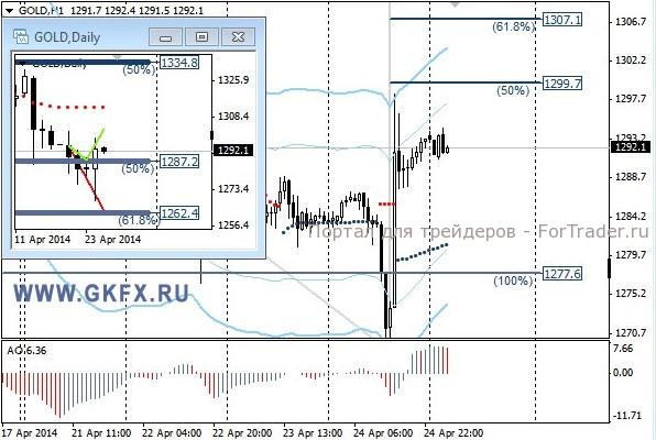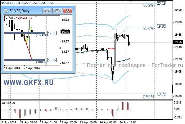 Цены на золото снижались, выполнив сделку по рекомендации на продажу по 1277,0. Первая цель была достигнута на уровне 1270,0, и можно было стоп переместить на уровень открытия сделки. Чуть позднее цены на золото резко выросли, закрыв сделку по безубытку. Резкий рост объясняется тем, что в Украине произошло столкновение военных с протестующими и в результате имеются жертвы. Реакция России на это, возобновление учений около Украинской границы и резкие заявления о военном вмешательстве в случае угрозы жизни жителям юго-востока Украины. События в Украине вновь начинают оказывать влияние на рынок драгметаллов. Традиционно делаю два варианта движения цены на неделю, основной красный и альтернативный зеленый. Значимые уровни на сегодня отмечены на часовом графике. Индикатор АО находится в положительной зоне и снижается, указывая на коррекцию перед возможным продолжением роста. Индикатор тренда указывает на рост. Вне рынка.