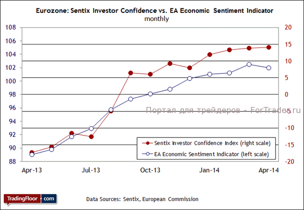 Поддерживают ли такую точку зрения инвесторы? Восприятие в экономике становится реальностью, поэтому даже самые высокие результаты ничего не значат, если инвесторы скептически оценивают перспективы роста. Статистика на этом фронте выглядит достойно, однако, возможно, восходящая тенденция замедляется. Индекс доверия среди инвесторов Sentix показывал неплохие темпы роста на протяжении последнего года, но, похоже, энтузиазм постепенно спадает. Об этом же свидетельствуют другие индикаторы настроений. Например, индикатор экономических настроений Европейской комиссии в апреле отметился первым снижением за период одного года. Более тревожный сигнал подает индекс настроений Sentix для Германии, который в прошлом месяце понизился третий месяц подряд. «Главный вопрос сейчас заключается в том, как экономика Еврозоны отреагирует» на умеренное снижение макроэкономического потенциала немецкой экономики, — отметила компания Sentix в пресс-релизе. Самый последний отчет ZEW об экономических настроениях также свидетельствовал об ухудшении ожиданий в отношении Германии.