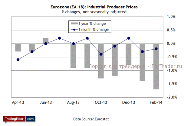 Более серьезное беспокойство у участников рынка вызывает сохраняющаяся тенденция к снижению промышленных цен в Еврозоне. В отличие от потребительских цен индекс цен производителей (PPI) уже давно находится в состоянии непрерывного падения. В предыдущем отчете за февраль промышленные цены понизились на 1,7% в годовом выражении, то есть темпы падения увеличились по сравнению с январским значением 1,4%. Сами по себе низкие промышленные цены не представляют серьезной угрозы, но перспектива непрерывно падающих цен в условиях общего ухудшения экономики говорит о том, что, если рост не наберет обороты, то экономика Еврозоны подвержена рискам.