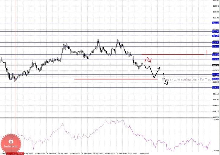 По паре Фунт/Йена ключевыми уровнями являются: 122.30, 121.49, 121.09, 120.47, 120.11, 119.36, 118.94, 117.54, 117.11 и 116.31. Здесь диапазон 117.54 – 117.11 является ключевой поддержкой для восходящей структуры от 22 сентября, в нем мы ожидаем краткосрочное нисходящее движение, пробой последнего значения приведет к отмене развития восходящей структуры в масштабе Н1, в данном случае первая цель 116.31. Краткосрочное восходящее движение, возможно в коридоре 118.94 – 119.36, пробой последнего значения будет располагать к развитию восходящей тенденции, здесь первая цель 120.11. Далее ключевые уровни для верха остались без изменения.