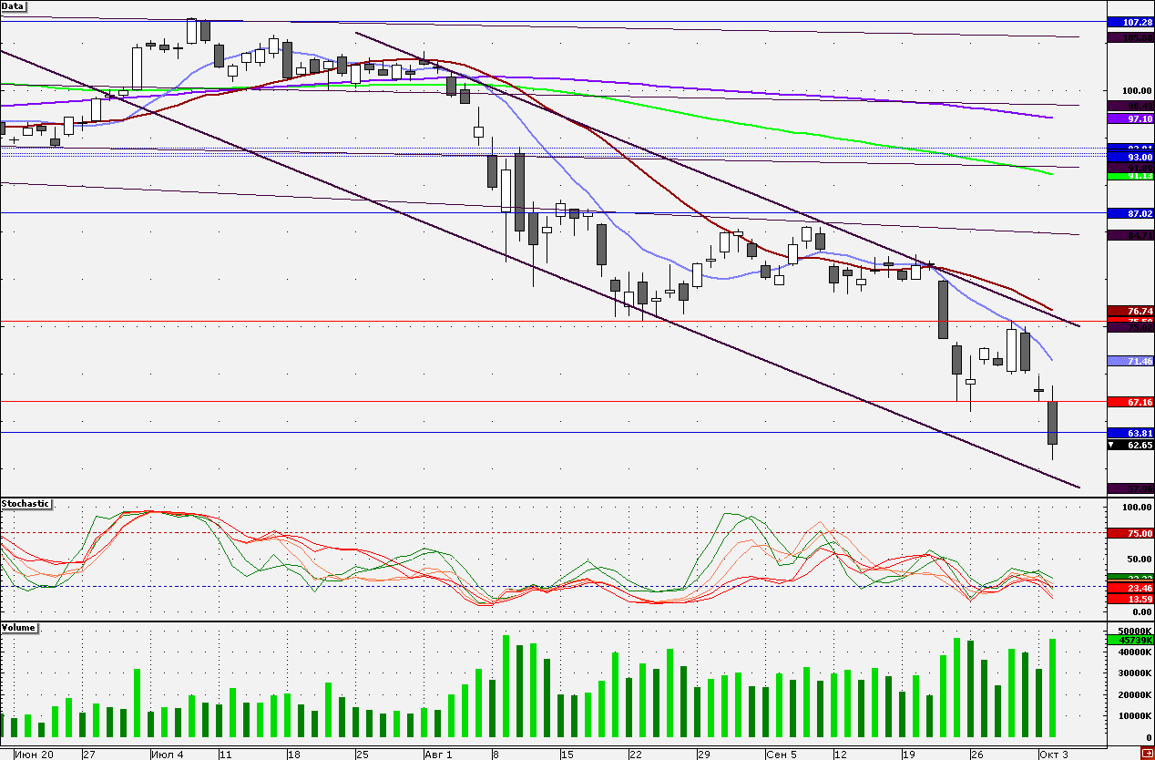 Акции Сбербанка торгуются в нисходящем тренде, при продолжении падения акции могут вернуться к нижней границе 58,50 руб. Сопротивлением является 63,80 руб., далее акции могут устремиться к 66,00 руб. Акции Сбербанка перепроданы, в связи с чем бумаги особенно привлекательны на отскок.