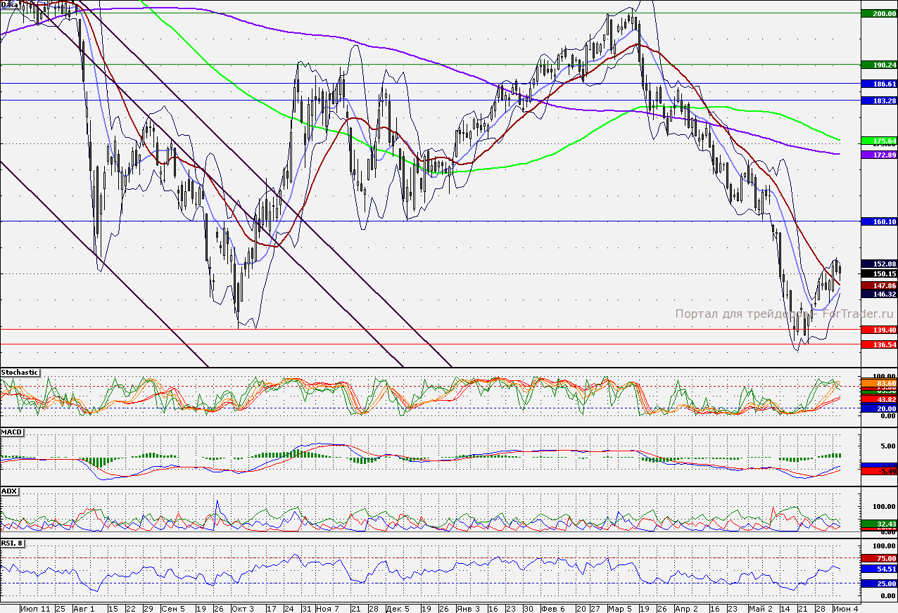Ближайшие уровни поддержки: 150,00/147,86/145,00/143,00/140,00