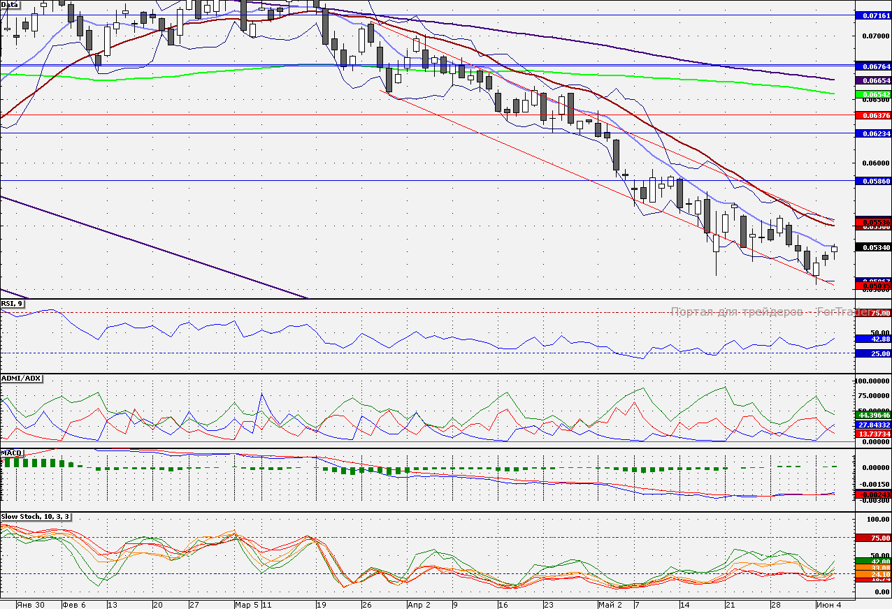 Акции ВТБ закрылись на 10-дневной скользящей средней 5,341 коп. Целью является отметка 5,500 коп., где проходит 21-дневная скользящая средняя. Поддержкой остается 5,000 коп.