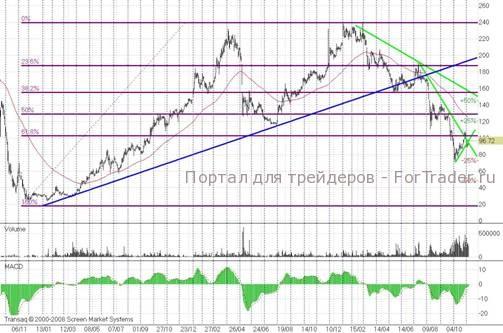 Друзья-трейдеры попросили разобрать акции «Распадской». Первое, что хочется отметить, это возросший с начала октября объем торгов. Массовые торговые действия в районе 70-80 рублей укрепляют этот рубеж как поддержку. Тем не менее, тренд, проведенный через уровни 70 и 80 рублей с 4 октября, не выжил, и отметки носят лишь характер поддержек горизонтальных рубежей. Бумаги вязнут вне технических отметок сейчас. Индикатор MACD говорит то же – спешить некуда, прибывая на дневных графиках в зоне «медведей». Так что, если эти акции нужны вам для покупки, то лучше дождаться их выхода в зону над отметкой 110 рублей. Так они утвердят пробой нисходящего тренда от июля 2011 года и пробьют линию коррекции по Фибоначчи 61,8% к росту бумаг с января 2009 года по март 2011 года.