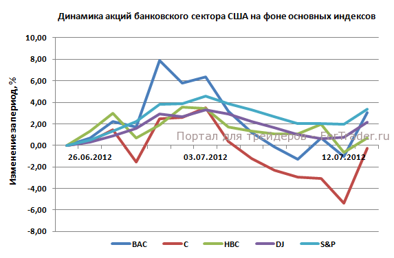Также влияние на рынок продолжили оказывать новости корпоративного сектора. В пятницу, 13 июля, до открытия торговой сессии, свои отчеты о финансовых результатах за II квартал 2012 года представили одни из крупнейших по размерам активов банки США — JPMorgan Chase и Wells Fargo. Обе компании отметились удачными результатами, что положительно повлияло на их рыночную капитализацию.