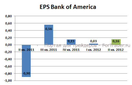 Динамика выручки также остается отрицательной: по итогам I кв. 2012 года, данный показатель уменьшился на 17,11% до $22,28 млрд., по сравнению с аналогичным периодом 2011 года ($26,88 млрд.) и на 30,31% по сравнению с I кв. 2010 года ($31,97 млрд.). По сравнению с IV кв. 2011 года, выручка Bank of America снизилась на 10,49%. Больше всего по итогам I кв. 2012г. разочаровали данные по чистой прибыли, которые уменьшились на 81,14% до $328 млн. по сравнению с аналогичным периодом 2011 года ($1,739 млрд.) и на 88,43% по сравнению с I кв. 2010 года ($2,834 млрд.). По сравнению с IV кв. 2011 года чистая прибыль банка уменьшилась на 79,29%. Показатель EPS в I кв. 2012 года также уменьшился и составил $0,03 против $0,17 в I квартале и $0,15 в IV кв. 2011 года. По итогам I кв. 2010 EPS составил $0,28. Сумма выданных займов в I кв. 2012 уменьшилась на 36,6% до $902,29 млрд. по сравнению с I кв. 2011 года и на 7,56% по сравнению с I кв. 2010.