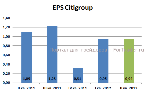 Свою финансовую отчетность за II квартал 2012 года Citigroup публикует в понедельник, 16 июля. Выручка компании в I квартале 2012 года уменьшилась на 1,62% до $19,41 млрд., по сравнению с аналогичным периодом 2011 года ($19,73 млрд.) и на 23,66% по сравнению с I кв. 2010 года ($25,42 млрд.). Однако, по сравнению с IV кварталом прошлого года выручка выросла на 13% ($17,17 млрд.). Чистая прибыль банка в I кв. 2012 уменьшилась на 2,27% до $2,93 млрд. по сравнению с аналогичным периодом 2011 года ($3,00 млрд.) и на 33,81% по сравнению с I кв. 2010 года ($4,43 млрд.). По сравнению с неудачным для Citigroup IV кв. 2011 г. чистая прибыль увеличилась на 206,59% ($0,96 млрд.).
