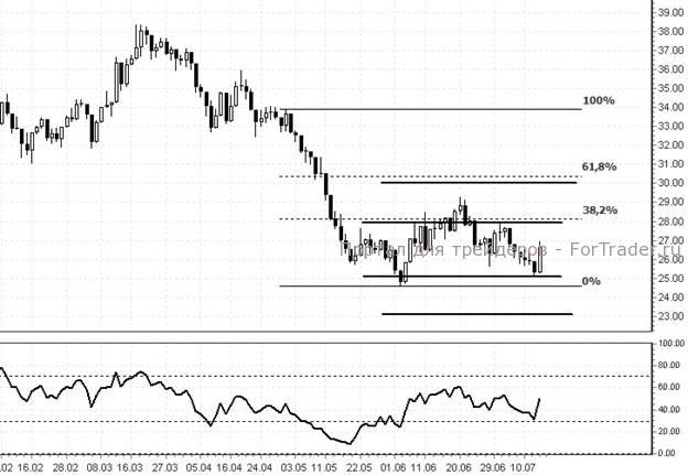 Рекомендуем продажи при пробое вниз уровня поддержки $25,15 за акцию. Цель: $23. Покупка возможна при пробое вверх уровня сопротивления $27,92 за акцию с последующей целью $30. Для краткосрочной торговли, рекомендуем использовать отбойную тактику торговли внутри диапазона.