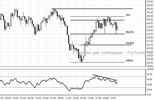 С точки зрения технического анализа, график цены находится в пределах торгового коридора, ограниченного уровнями $42,56 и $44,42 за акцию. К моменту публикации своих финансовых результатов за II кв. 2012г., акции банка вероятно будут оставаться чувствительными к другим корпоративным новостям финансового сектора. В случае формирования положительного фона и, как следствие, пробоя вверх уровня сопротивления $44,42 за акцию, следующей целью будет ценовая отметка $46. В противном случае, при пробое вниз уровня поддержки $42,56 за акцию (38,2% Fibo), возможна реализация ФГА «Голова и плечи» с последующей целью $41 (61,8% Fibo).
