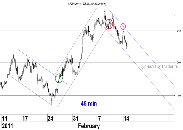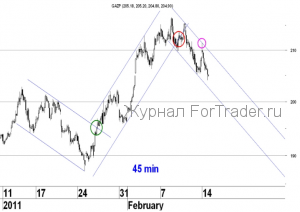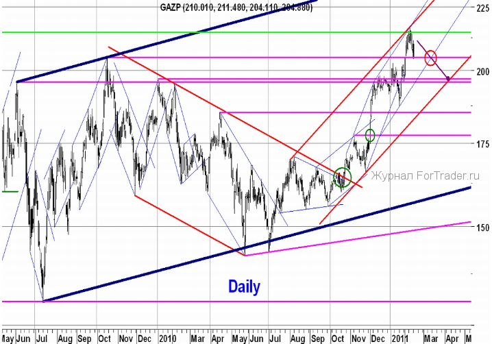 На 45-ти минутном графике  видно, что сегодня в акциях Газпрома была предпринята попытка пробить  верхнюю границу краткосрочного нисходящего канала, однако после  её достижения рынок развернулся вниз и теперь акция находится недалеко от нижней границы этого канала. Если выход из этого канала всё же будет вверх, скорей всего это будет означать завершение нисходящей коррекции и мы увидим попытку пробоя горизонтального уровня сопротивления 214.6-222.6 р. Пока же на дневных графиках складывается не очень радужная картина: акции Газпрома «проткнули» горизонтальную поддержку 205 р.,  — это максимум 2009 г. и ещё недавно он являлся достаточно сильным уровнем сопротивления. Если дневная свечка закроется ниже этого уровня — скорей всего снижение продолжится до нижней границы краткосрочного восходящего канала на дневном графике.