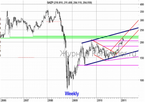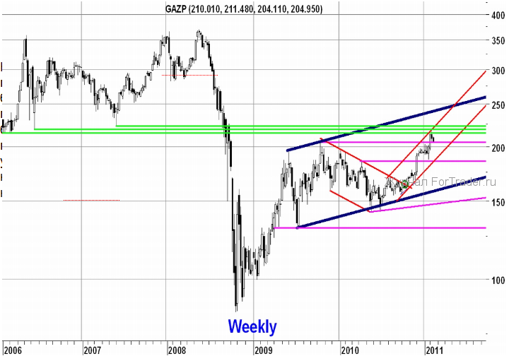 На прошлой неделе акции Газпрома подошли к важному долгосрочному горизонтальному уровню сопротивления 214.6-222.6 р., который в 2006-2007 годах был сильным уровнем поддержки и после пробоя которого осенью 2008 г. произошло ускорение нисходящего движения, после чего акции ещё ни разу  не были выше этого уровня. Обычно с первого раза такие сильные уровни не преодолеваются и мы видим, что после того, как в прошлый вторник был установлен новый двухлетний максимум 216.65 р., произошла довольно резкая нисходящая коррекция и сегодня был обновлён минимум прошлой недели,  котировки Газпрома достигли отметки 204 р.