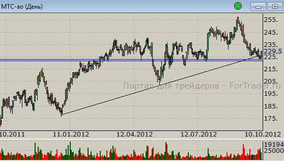 Акции «МТС» рассмотрим подробнее. Ниже представлен дневной график котировок по состоянию на закрытие 10 октября.