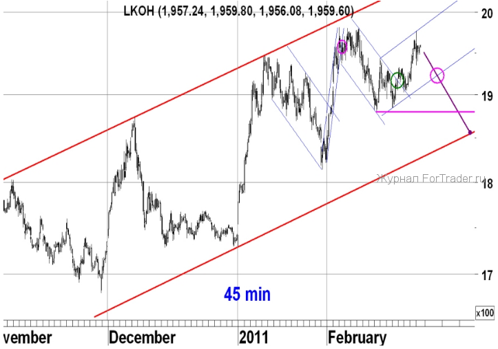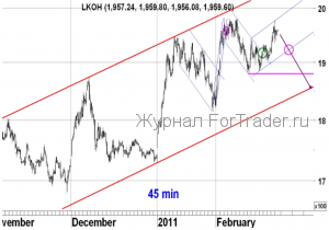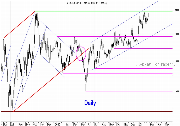Несмотря на то, что в конце ноября была пробита нижняя граница краткосрочного восходящего канала на дневном графике, всего одна дневная свечка была закрыта ниже этой границы, после чего акции Лукойла развернулись вверх, вернувшись в обратно в восходящий канал. Таким образом, пробой этого канала оказался ложным. В начале декабря акции Лукола обновили максимум 2010-го г., но после достижения отметки 1874 р. произошла достаточно резкая нисходящая коррекция и в конце декабря котировки опять достигли нижней границы краткосрочного восходящего канала, которая в очередной раз оказалась мощной поддержкой для рынка. В новом году восходящее движение продолжилось и в начале февраля акции Лукойла вплотную приблизились к максимуму 2009-го г. 1991 р. Однако, не дойдя до него всего десять рублей, произошёл разворот и последние несколько недель мы наблюдали нисходящее коррекционное движение.