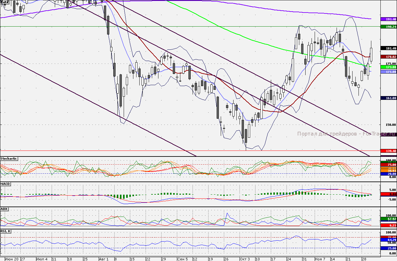 Акции «Газпрома» из-за новостей по ожидаемым дивидендам торговались лучше рынка и смогли закрыть гэп, сформированный 18 ноября. Сопротивлением является отметка 185,00 руб. Поддержкой является 180,00 руб. и далее 21-дневная скользящая средняя (178,02 руб.).