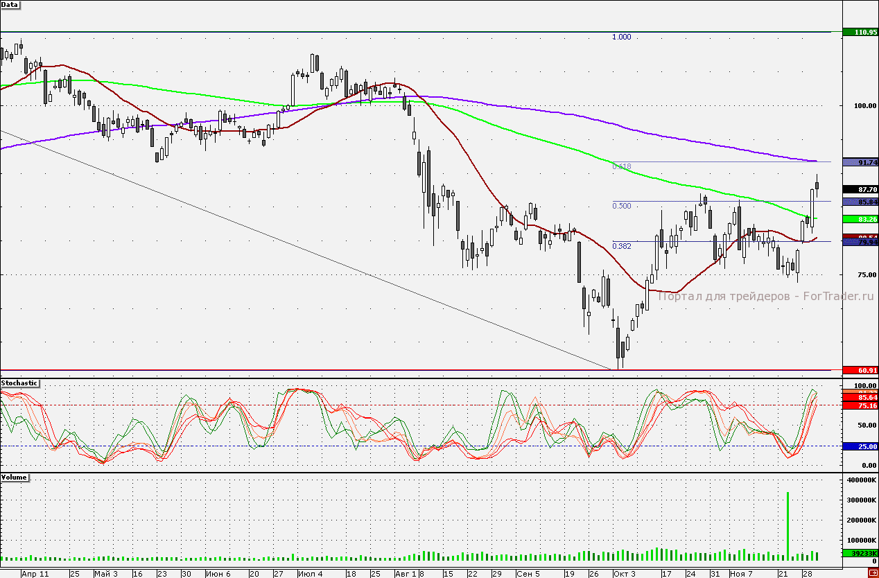 Акции банка в четверг обновили посткоррекционный максимум и вплотную подобрались к психологическому сопротивлению 90 руб., которое актуально и сегодня. При пробитии вверх данного уровня акции могут устремиться к 200-дневной скользящей средней – 91,74 руб. Далее сопротивлением является 95 руб. Поддержкой является 50%-ая коррекция по Фибоначчи от годового максимума к минимуму года — 85,84 руб.