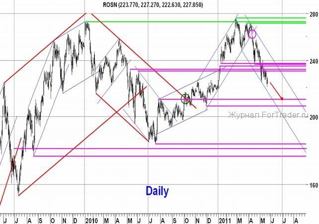 После того, как в середине марта акции Роснефти отскочили от нижней границы краткосрочного восходящего канала на дневном графике, в котором они повышались с начала года, было несколько попыток обновить трёхлетний максимум 276.2 р., однако они так и не увенчались успехом и от отметки 271 р. произошел разворот вниз. В середине апреля гэпом была пробита нижняя граница краткосрочного восходящего канала, после чего мы наблюдали почти отвесное падение до горизонтальной зоны поддержки 232-237.8 р., которая в итоге также был пробит вниз. Вчера была достигнута отметка 220 р., после чего произошел отскок вверх и сейчас мы наблюдаем восходящую коррекцию.