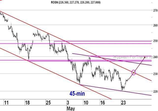 На 45-ти минутном графике видно, что падение, которое мы наблюдаем в акциях Роснефти с начала апреля, происходит в среднесрочном нисходящем канале. Сейчас акция находится недалеко от верхней границы этого канала, и если она будет пробита, скорей всего мы увидим продолжение восходящей коррекции в зону горизонтального сопротивления 237.3-240.4 р. Также камнем преткновения может стать верхняя граница более пологого среднесрочного нисходящего канала. В случае пробоя горизонтального уровня 240.4 р. скорей всего восходящее движение продолжится до следующего горизонтального сопротивления 248-249.5 р. Если же годовой минимум 220 р. будет пробит, вероятнее всего акции Роснефти снизятся в горизонтальную зону поддержки 206.8-211.4 р.