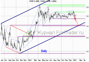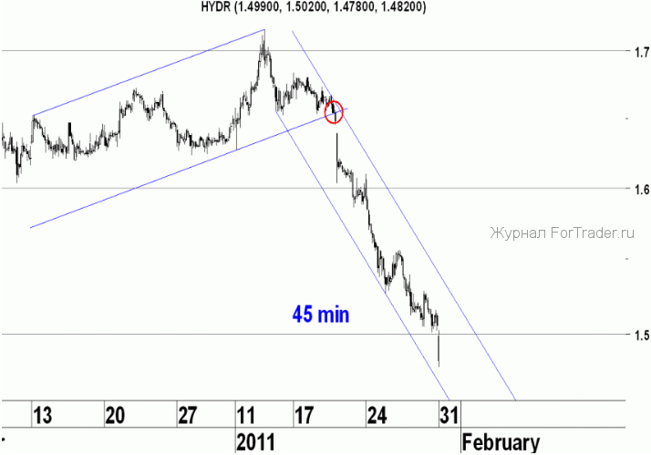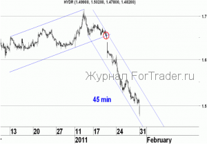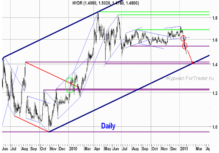 Нисходящее движение, которое мы наблюдаем последние две недели в акциях Рсгидро, является достаточно сильным и происходит без каких-либо значимых коррекций. В результате этого движения сначала была пробита нижняя граница краткосрочного восходящего канала, а затем и нижняя граница того бокового канала, в котором акции находились с июля прошлого года, и из которого, как ещё недавно казалось, они вышли вверх. Следующей целью снижения может стать важный уровень поддержки 1.400-1.415 р., который в середине февраля будет пересекаться с нижней границей долгосрочного восходящего канала на дневном графике. Пока на 45-ти минутном графике акции Русгидро находится в краткосрочном нисходящем канале, в котором они снижаются от своего годового максимума, сценарий продолжения нисходящего движения более вероятен. Если же акция пробьёт верхнюю границу этого канала, можно попробовать сыграть вверх в расчете на восходящее коррекционное движение, с защитным стопом на годовом минимуме.
