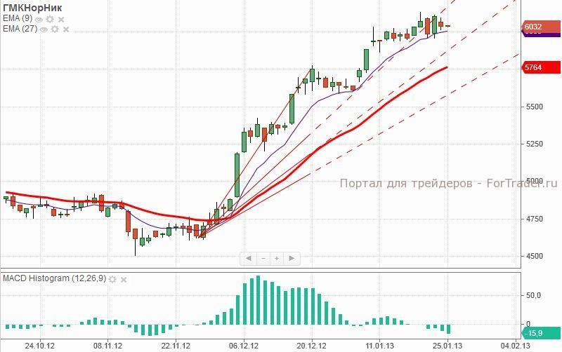 Дневной график акций ГМК НорНикель на восходящем тренде формирует дивергенцию. Вероятна коррекция к средней EMA (27) примерно на уровень 5764 руб. за акцию. Покупки актуально возобновить при пробитии 6150 руб. за акцию.