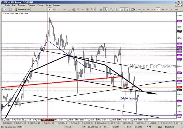 Общая динамика изменения расчётных уровней индекса Dow Jones в период торгов в среду, 18 мая, формируется основной тенденцией снижения среднего показателя недельных торгов (чёрная линия). Конечно, можно принимать в расчёт, в качестве основной, тенденцию роста с конца прошлого года. Однако та тенденция с конца года указывает на своё завершение, может и временное, но завершение в области уровня 12500. Попытка роста выше 12500 не получилась на пути в область уровня 13000, потеряв темп роста в области уровней 12700-12800, что и не удивительно, с началом ухода с сырьевых рынков «акул» и «акулят». В общем, оснований для возобновления устойчивого, подчеркну, устойчивого роста выше области 12500-12569, не видно. Что же, вторая половина текущей недели, как кажется, завершится снижением в область уровней 12331-12425, как минимум.