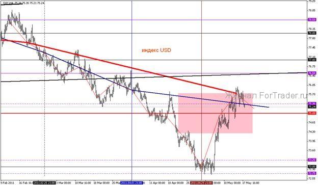 Индекс доллара уверенно продолжает торговаться выше уровня 75,00, хотя и не вышел за пределы диапазона 75,00-75,75. С другой стороны, коррекционный роста индекса не завершён и до конца мая его падение ниже уровня 75 и закрепление в области 74,25-74,75, уже менее вероятно, чем закрепление в диапазоне уровней 75,75-76,50.