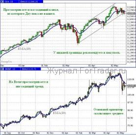 В начале прошлой недели после небольшой коррекции американский фондовый рынок собрался было вверх. Причём, намерения «быков» казались более чем серьёзными – наблюдался уверенный рост в течение трёх дней. Но уже в среду, 11 мая, на дневном графике индекса Доу-Джонса сформировалась длинная «медвежья» свеча, перечеркнувшая все усилия покупателей. В четверг «медведи» пытались продолжить атаку, но делали это слишком вяло, в результате чего рынок практически остался на месте. На дневном графике Доу скользящее среднее ЕМА(10) стало рисовать горизонтальную линии, отражая тем самым равенством сил продавцов и покупателей. Правильнее было бы, пожалуй, сказать: «Отражая отсутствие силы как у продавцов, так и покупателей». Возможно, у большинства отпускное настроение.