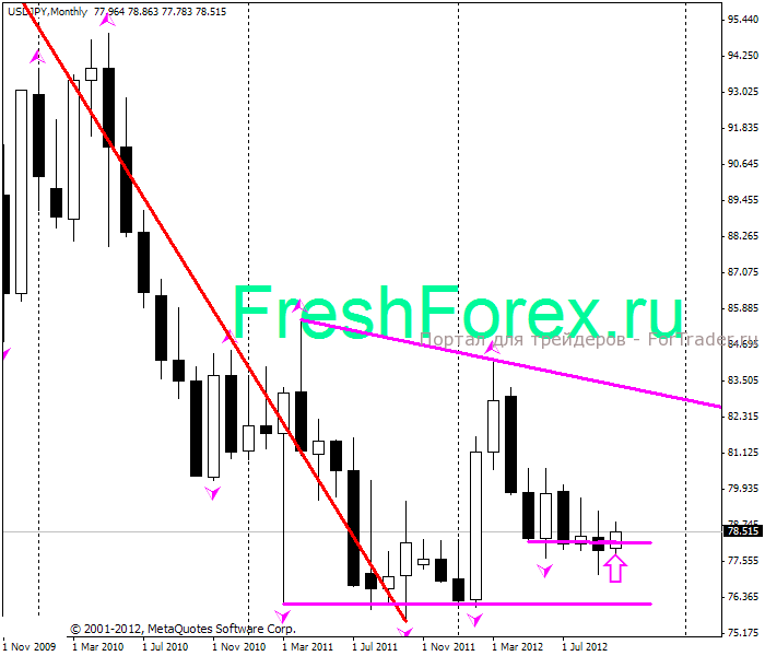 Последние шесть месяцев или около того USD/JPY медленно снижается с мартовских максимумов около 84. В последние несколько месяцев она образовала нисходящий треугольник с твердым уровнем поддержки около 78. На протяжении всего последнего месяца, этот уровень оказывает неизменную поддержку паре и временно остановливает неуклонное падение. Несколько недель назад, пара торговалась ниже 78 хотя и очень быстро была выкуплена с тех уровней. 78 — уровень самый низкий с 1 июня.