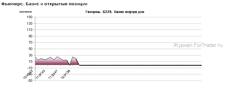 Фьючерс на акции ОАО «Газпром» (GZZ0): с утра фьючерс находился в положительном базисе, на 13-00 мск базис составил 30 пунктов (рис.1), а фьючерс GZZ0 подрастает на 0,8%.