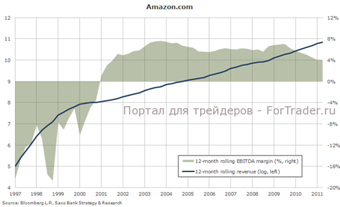 Как показывает логарифмическая кривая доходов, темпы роста, несмотря на расширение владений компаний, оставались в значительной мере устойчивыми. После краха интернет-компании, рентабельность по EBITDA стабилизировалась на уровне 4-7 %, но недавно снизилась до 4 % вследствие крупных инвестиций в будущее и агрессивного ценообразования для Kindle Fire.