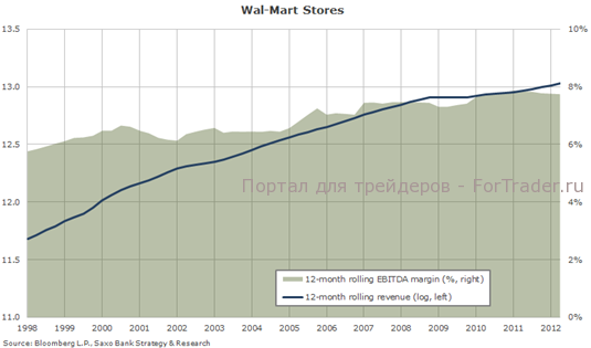 Начиная с 1997 г., скользящий доход Wal-Mart за 12 месяцев возрос на 34,7 % или 9,9 % в годовом исчислении до 455,8 млрд. долларов США в прошлом финансовом квартале. За этот период рентабельность по EBITDA отличалась крайней устойчивостью и непрерывным ростом на уровне от примерно 6 % до чуть меньше 8 %.