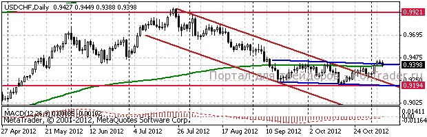 Ближайшей поддержкой выступает область Chf0.9395/80 (200дневной МА), ниже поддержки будут встречены возле Chf0.9255/45 (минимум 22 октября) и Chf0.9215/10 (минимумы 1718 октября). Целью быков выступит область Chf0.9470/85 (максимумы 910 сентября), далее Chf0.9500.