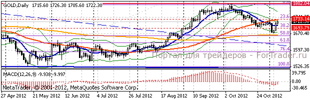 Фьючерсы взлетели выше $1722 (средняя линия Боллинджера 20дневная МА). Следующий уровень сопротивления будет найден на $1733 (55дневная МА), более серьезный ожидает в области $1755/65 (максимумы середины октября, верхняя граница Боллинджера).
