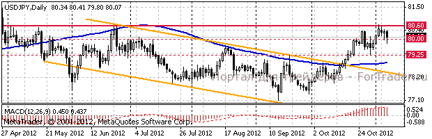 Ближайшая поддержка область Y79.80/70 (утренние минимумы 7 ноября) и Y79.10/00. В случае преодоления области сопротивления Y80.60/70 (максимум 25 июня) быки направятся к Y81.40 (максимум 2627 апреля), а затем к Y81.80/90.