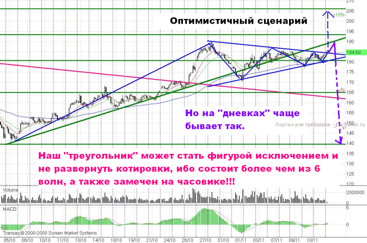 Что касается идей, то идея есть в «Газпроме» — разброс между сопротивлением и пиком первой волны 2,2%, в «Сбербанке» чуть больше 1%, по индексу ММВБ 1,5%. Так что, на пробое 186-185,7 рублей можно попробовать до пика первой волны треугольника – 190,24 рубля, протащить, например фьючерс. Если треугольник отменит свою разворотную силу, и пойдет выше 190,24 – никто не мешает вам давать прибыли течь.