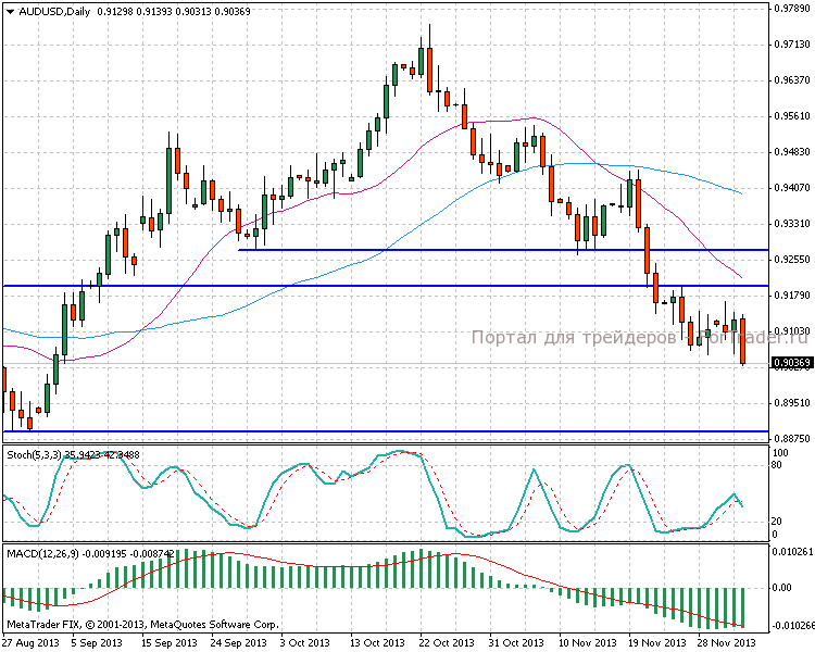 Квартальный прирост ВВП Австралии составил 0,6% против прогноза 0,7%, что в совокупности с продолжающимся падением цен на цветные и драгоценные металлы привело к падению курса австралийской валюты почти на 100 пунктов. Цена обновила месячные минимумы, индикаторы подтверждают медвежий тренд.