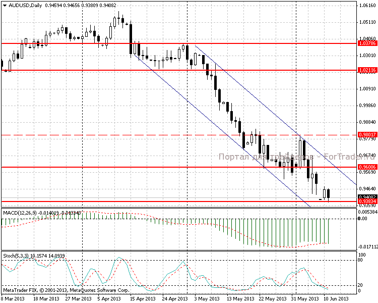 На выходных вышли данные по Китаю, которые оказались хуже прогноза. Это послужило причиной того, что в понедельник торги по AUD/USD открылись с гэпом вниз на 100 пунктов. Цена достигла сильного уровня поддержки 0,9386 (минимум последних трех лет, установленный в сентябре 2011 года). MACD-гистограмма продолжила снижение, а стохастический осциллятор опустился под отметку 20, намекая на состояние перепроданности.