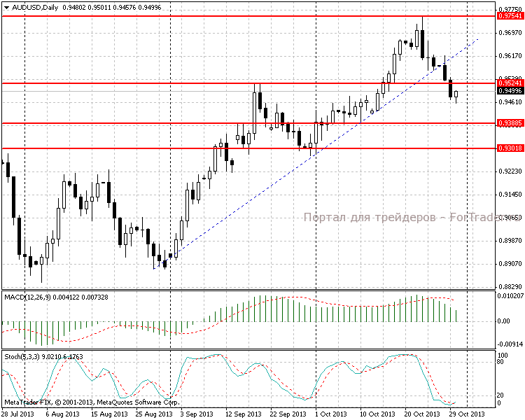 На дневном графике цена пробила линию тренда и ключевую поддержку 0,9525. Ослабление австралийской валюты было вызвано выступлением главы Резервного Банка Австралии Стивенса, который заявил, что текущий курс австралийского доллара остается завышенным и не соответствует экономическим условиям. Индикатор MACD указывает на дальнейшее снижение, а стохастический осциллятор опустился в зону перепроданности.