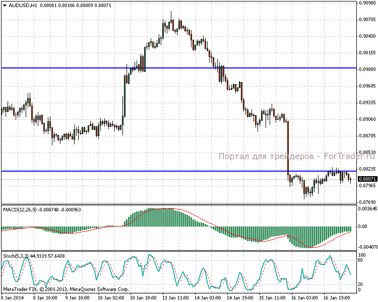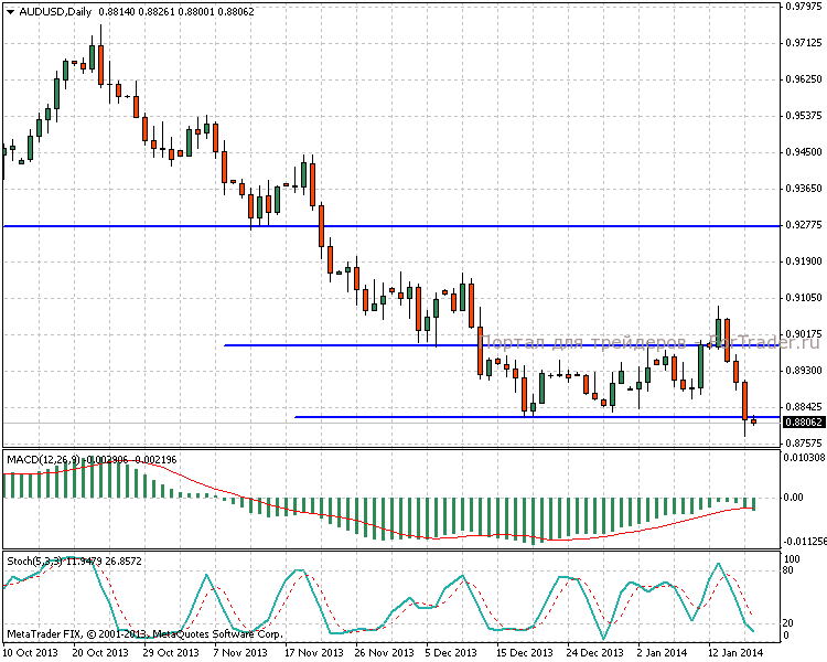 Австралийский доллар за последние дни сильно снизился относительно американской валюты. В особенности этому поспособствовали слабые данные по рынку труда Австралии. Число рабочих мест в стране в декабре 2013 года снизилось на 22 тыс. вопреки прогнозируемому росту на 10 тыс. По итогам вчерашних торгов пара AUD/USD закрылась немного ниже ключевой поддержки 0,8820 и сейчас торгуется в районе 0,8800.