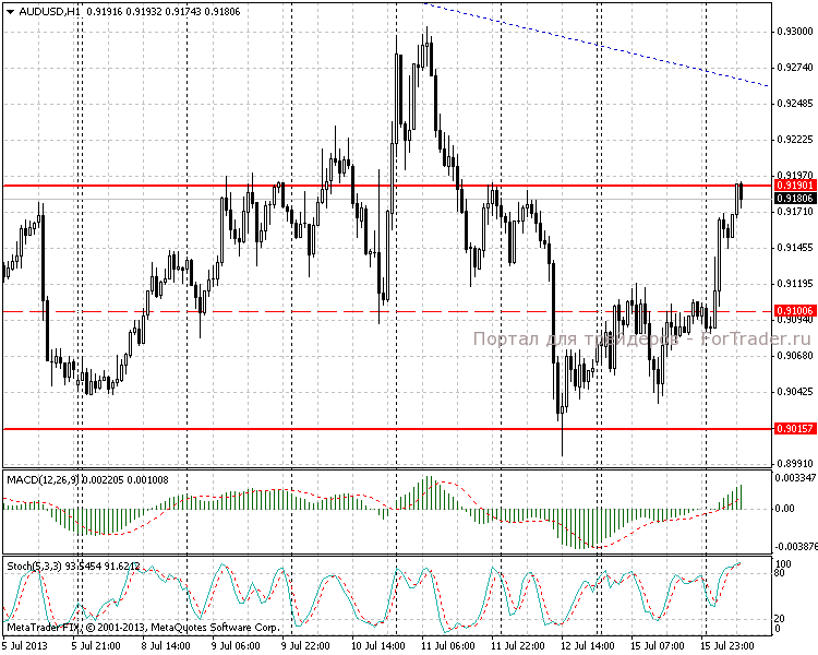 На часовом графике видим, что цена после пробоя локального уровня 0,9100 подошла к следующей ключевой зоне сопротивления 0,9190-0,9200. Часовая MACD-гистограмма продолжает рост, а линии стохастического осциллятора расположены выше отметки 90, сигнализируя о состоянии крайней перекупленности.