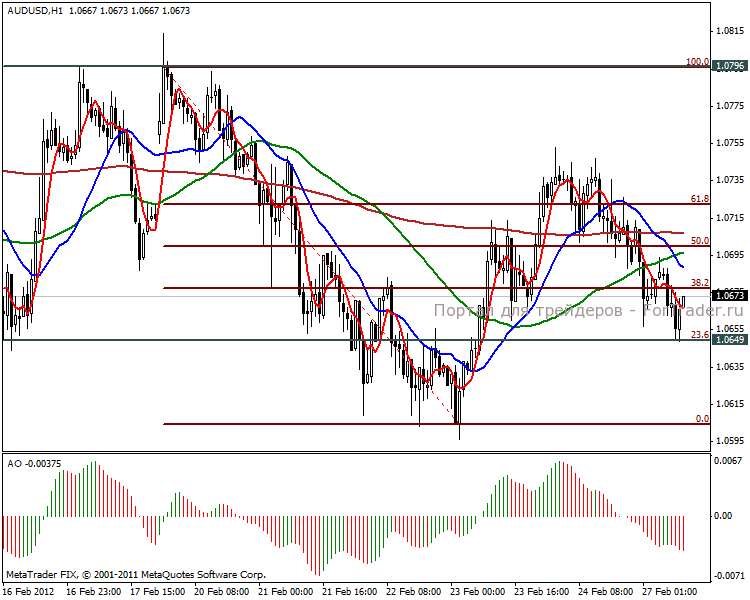 На часовом графике пара показывает длительное нисходящее направление. Вероятнее всего произойдет пробой линии поддержки 1.0649 пунктов в направлении взятия цели 1.0600 пунктов. Индикатор показывает закрепление волны снижения и данная тенденция будет длительной, и намного глубже, определив при этом хорошую позицию для шорта.