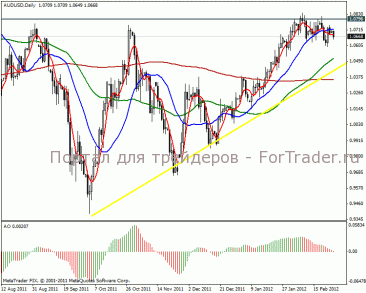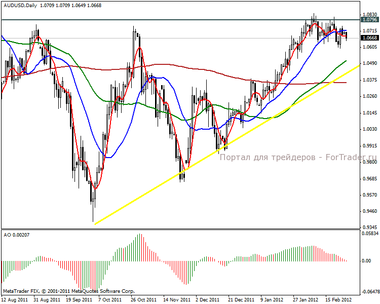 На дневном графике видим треугольник. Отбившись от линии сопротивления, цена движется в направлении линии основного повышательного тренда к 1.0513 пунктов. В среднесрочной перспективе ожидаем пробой сопротивления 1.0796 пунктов и сильное ослабление австралийца.