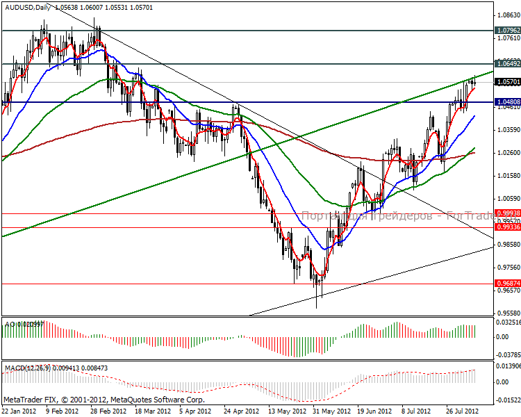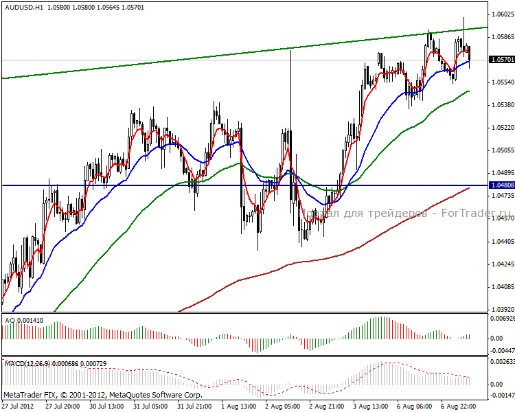 На часовом графике видим пробой сильной линии сопротивления, цена закрепилась в диапазоне 1.04808-1.44100 пунктов. В данный момент ЕМА указывают на завершение растущей волны, поэтому вероятна незначительная коррекция к поддерживающей линии. Что касается внутридневной торговли, рекомендуем не входить в сделки, поскольку растущая тенденция достаточно сильная, чтобы ловить снижение.