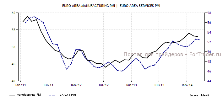 Евро торговался с понижением в первой половине дня после выхода данных по деловой активности в еврозоне, которая упала в марте до двухмесячного минимума. Данные по еврозоне оказались чуть хуже ожиданий: индексы PMI во Франции выросли, превысив отметку 50, в то время как в Германии упали. Активность в производственном секторе Германии снизилась до 4-месячного минимума, в секторе услуг до 2-месячного. Композитный индекс деловой активности еврозоны снизился в марте до 53,2 п., с 53,3 п. в феврале, тогда как изменений не ожидалось. В феврале значение было максимальным с июня 2011 года.