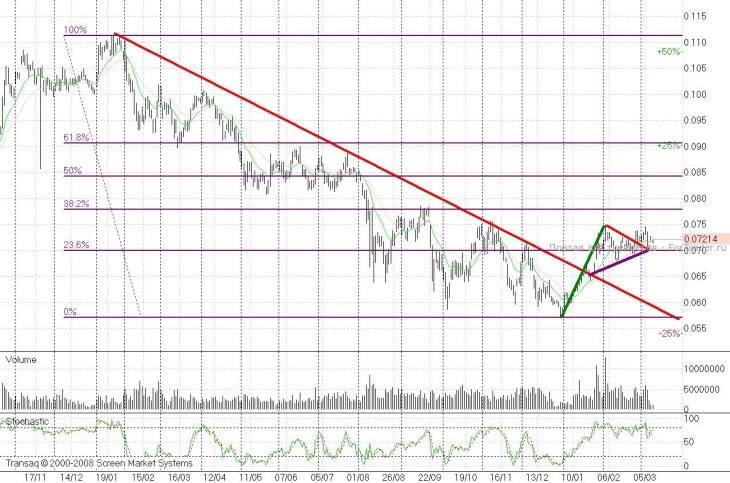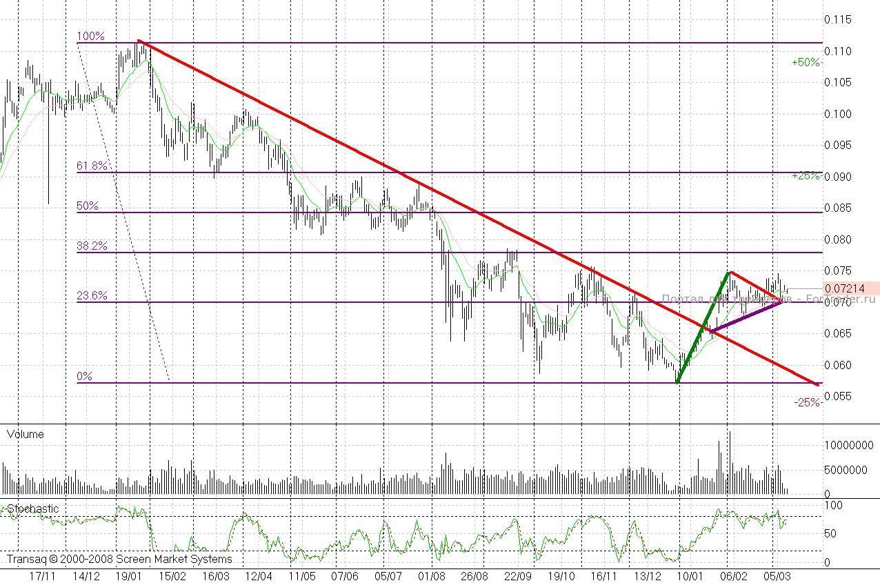 Интересная формация есть и на графике акций «ВТБ». Также на прошлой неделе я говорила об отсутствии серьезного тренда в бумагах, но предупреждала о сформировавшемся «симметричном треугольнике». Для меня эта фигура несет разворотные свойства в большинстве случаев. Но хотя на графике «ВТБ» котировки не пускает наверх пик первой волны «треугольника», как у коварной версии фигуры, я не склонна ждать бумаги у дна прошлого года. «Треугольник» слишком быстро сформировался, чтобы нести реальную угрозу.