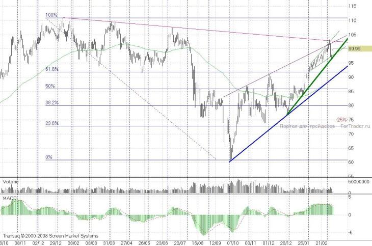Теперь в качестве поддержки для бумаг выступает отметка 97,4 (восходящий тренд декабря), а важное сопротивление 102,7 («крыша мира» — линия, соединяющая прошлогодние пики). По идее, если изловчиться купить бумаги у поддержки, риск и доходность будут в приемлемом соотношении. Но так как скорость движения котировок ускорилась в «расширяющейся формации», вряд ли вы успеете полностью реализовать торговый план. При достаточном опыте, при такой картинке можно спекулировать фьючерсом на акации «Сбербанка». Если вы умереннее настроены, то стоит подождать появления красивых открытых целей.