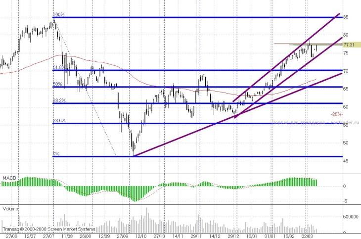 На графике привилегированных бумаг «Сбербанка» нет даже спекулятивных идей на «лонг». Ибо поддержка на уровне 75 рублей (восходящий тренд декабря 2011 года), а сопротивление 80-81 рубль (верхняя граница канала, параллельная указанному тренду).