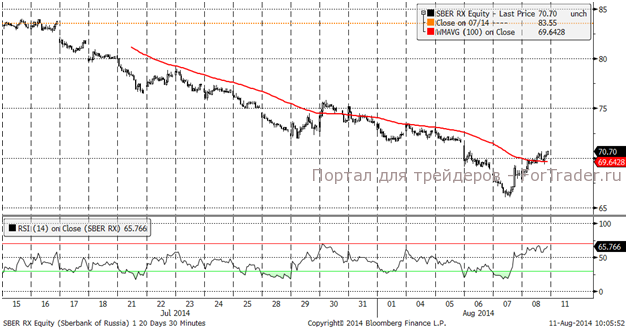 Рынок очень положительно воспринял новость о том, что российские банки не исключили из индекса MCSI. Акции Сбербанка уверенно закрепились выше скользящей средней. Путь наверх открыт, ближайшая цель – 75 рублей за акцию.