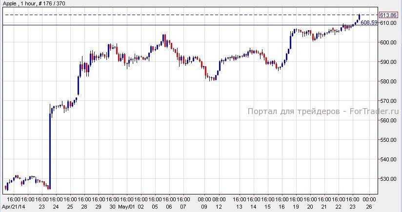 Акции Apple выросли на 1.13% и закрыли торги на цене $614, поскольку корпорация Apple собирается купить компанию-производителя наушников. Согласно техническому анализу 1-часового графика, акции продолжают расти и могут коснуться отметки $620.00. Однако, прорыв ниже уровня поддержки 608 вновь приведет акции к отметке 604.
